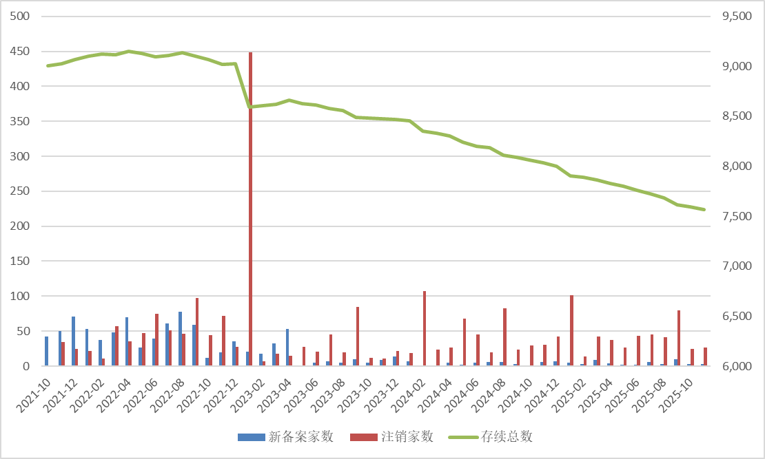 中基协数据显示,2022年至2025年各年度注销的证券私募管理人数量均在500家以上,四年间累计注销数量高达2326家。