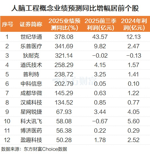 部分脑机接口概念股预计2025年业绩大幅增长。例如世纪华通预测业绩增长378.08%。乐普医疗、狄耐克等业绩也将翻倍。