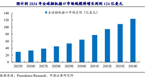 Precedence Research数据显示,2024年全球脑机接口市场规模约26.2亿美元,预计2034年有望达到124亿美元,2025~2034年复合增速有望达到17.4%。