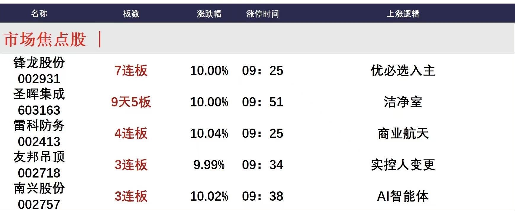 今日午盘全市场共80股涨停,连板股总数14只,26股封板未遂,封板率为75%(不含ST股、退市股)。焦点股方面,锋龙股份继续一字涨停晋级7连板,半导体洁净室概念股圣晖集成走出9天5板,商业航天概念股雷科防务4连板。