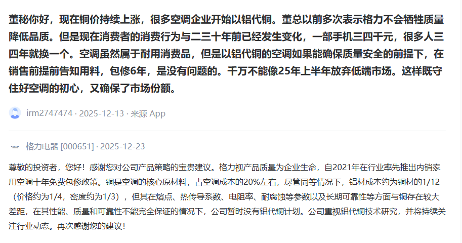2025年12月23日,格力电器也曾于互动平台表示,铜是空调的核心原材料,占空调成本的20%左右,尽管同等情况下,铝材成本约为铜材的1/12(价格约为1/4,密度约为1/3),但其在熔点、热传导系数、电阻率、耐腐蚀等参数以及长期可靠性等方面与铜存在较大差距,在其性能、质量和可靠性不能完全保证的情况下,公司暂时没有铝代铜计划。公司重视铝代铜技术研究,并将持续关注行业动态。