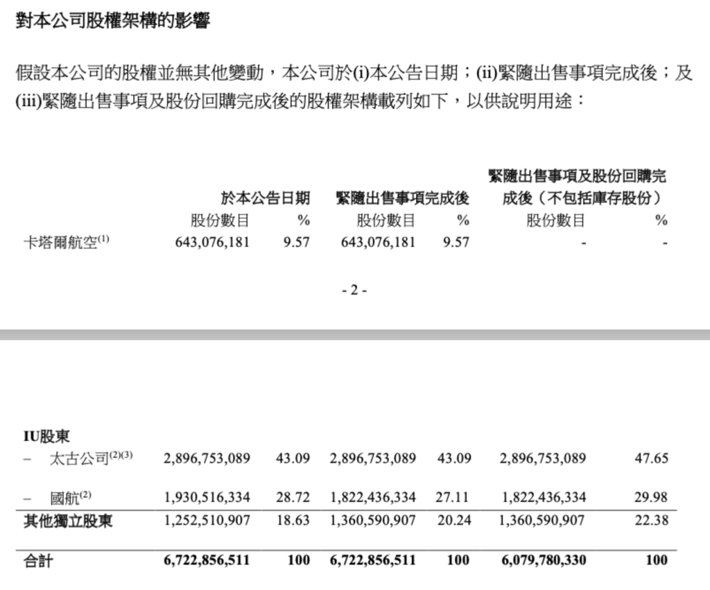 在出售事项及对卡塔尔所持股份回购完成后,假设国泰航空已发行股份无其他变动,太古公司对国泰航空的持股比例将由本公告日期约43.09%增至约47.65%,继续成为国泰航空的大股东。国航的持股比例将由约27.11%增至约29.98%。