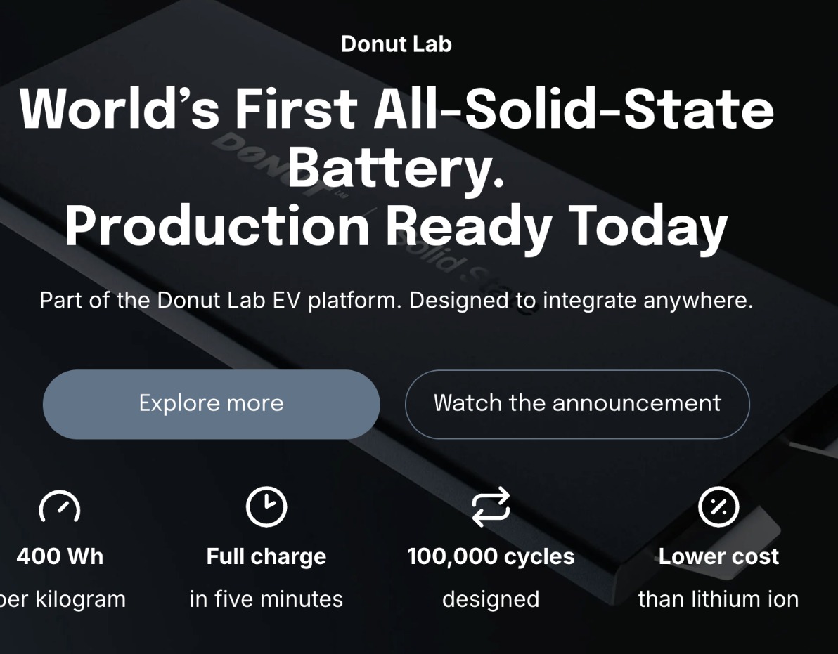 “固态电池现在可以应用于OEM(原始设备制造商)量产车型。”Donut Lab表示,公司研发了一种新型高性能全固态电池,能量密度高达400Wh/kg,可实现更长的续航里程,能够在短短五分钟内充满电,并支持安全、反复、可靠的完全放电,设计寿命高达10万次循环。