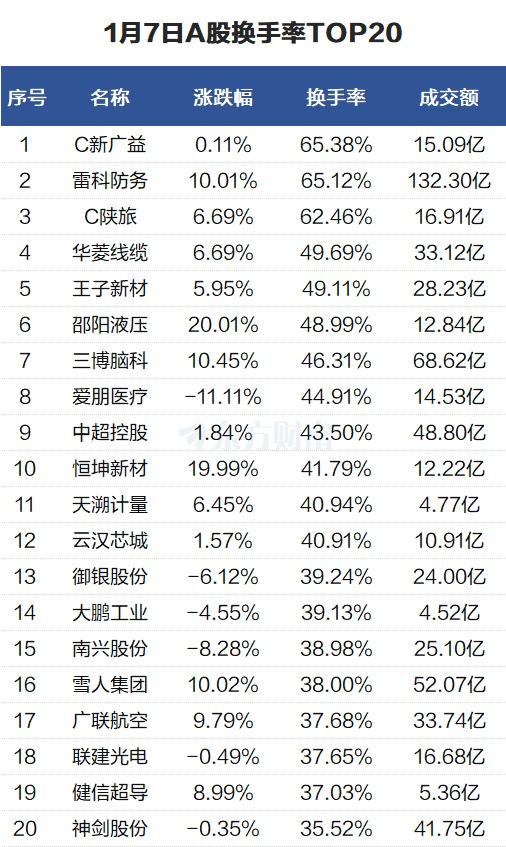 当天换手率最高的个股为C新广益,全天换手率65.38%。雷科防务紧随其后,全天换手率65.12%。