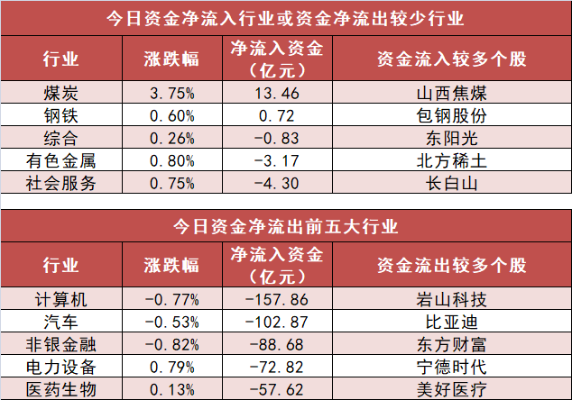 申万一级行业中,2个行业实现资金净流入,其中煤炭行业净流入13.46亿元居首。