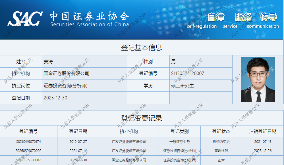 中证协官网资料显示,姜涛从业起步于广发证券,2019年7月进行了执业登记,2021年登记类别从一般证券业务变更为证券投资咨询(分析师),2025年12月26日离职注销。2025年12月30日,姜涛执业机构正式登记为国金证券。