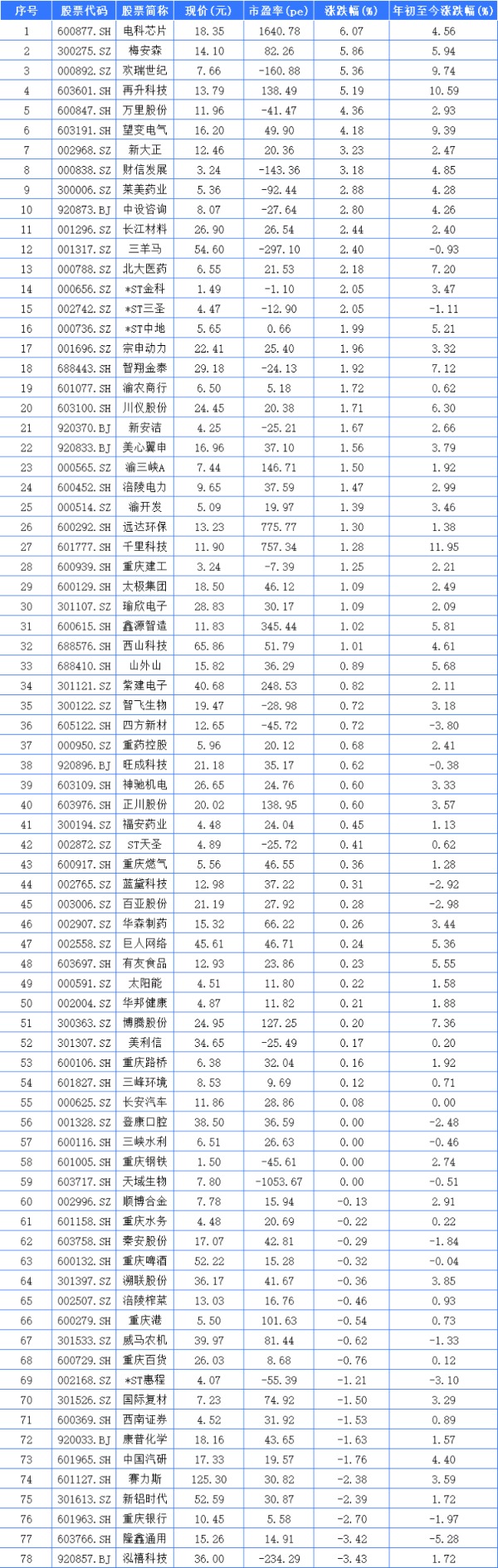 1月8日,78家重庆A股上市公司中有55家上涨。