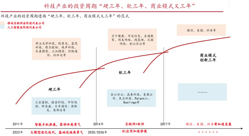 而方正证券从科技产业的投资周期角度认为,2026年会是AI应用的投资元年。该机构表示,科技产业的投资周期遵循“硬三年、软三年、商业模式又三年”的范式。2022-2025年,大模型持续进步迭代,驱动算力侧波澜壮阔的行情,光模块、PCB涨幅大幅领先。