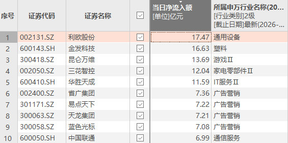 《p》Choice数据显示,1月9日,资金净流入额排名前十的个股依次是:利欧股份、金发科技、昆仑万维、三花智控、华胜天成、省广集团、易点天下、天龙集团、蓝色光标和中国联通。其中,利欧股份、金发科技获资金净流入均超15亿元。