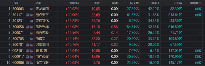 今日(1月9日),传媒板块热度飙升,截至收盘,中证传媒指数暴涨近5.5%,单日涨幅创2024年10月8日以来新高。个股方面,累计共有11只传媒股今日涨停,占整个板块标的近8.5%,其中,天龙集团、易点天下2股录得20cm涨停。