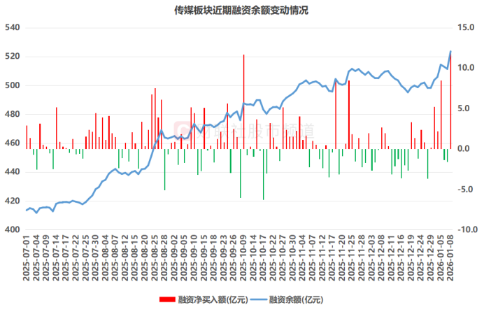 从资金面来看,2026年开年首周,融资客继续加仓传媒板块。截至1月8日数据,其目前融资余额已达523.5亿元,继续刷新阶段新高纪录,同时,其周内累计共获融资客近17.7亿元增持。其中,传媒板块1月8日、1月5日获增持规模较高,单日融资净买额分别达12.1亿元、8.5亿元,1月6日、1月7日则遭部分减持,净卖额分别为1.4亿元、1.6亿元。