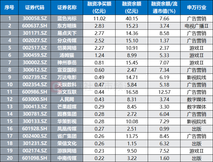 具体个股来看,同样截至1月8日数据,累计共有6股在周内获融资客增持超1亿元,分别为蓝色光标、东方明珠、易点天下、分众传媒、恺英网络、汤姆猫。其中,蓝色光标周内融资净买额达11亿元,在传媒板块中位居第一,同时在整个A股市场中位列次席,仅低于信维通信(15.3亿元)。此外,神州泰岳、宣亚国际、万达电影等股周内也获融资客关注。
