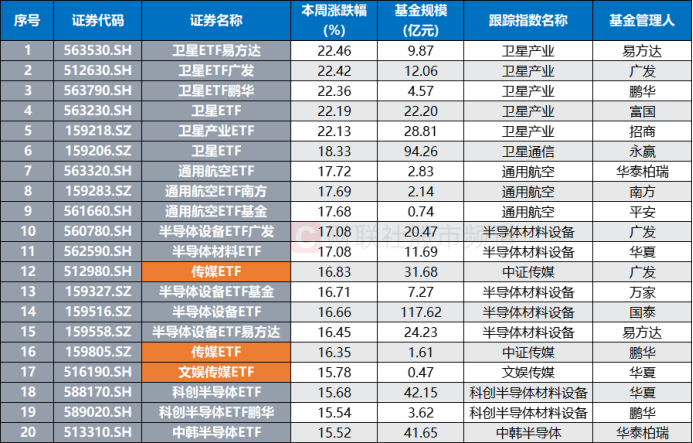 受板块持续走高提振,传媒相关ETF在本周的开年行情中表现活跃,与时下同样热度较高的通用航空、卫星、半导体系ETF共同领跑市场。截至今日收盘,跟踪中证传媒、中证文娱传媒、中证沪港深游戏及文化传媒指数的4只ETF本周平均上涨近15.86%,其中,基金规模最大的传媒ETF(512980)周内涨幅达16.83%,在整个ETF市场中位居第12位。