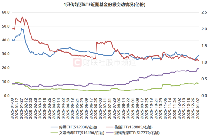从基金份额上看,上述4只传媒系ETF开年首周则各有增减。截至1月8日数据,游戏传媒ETF(517770)、传媒ETF(512980)、传媒ETF(159805)周内份额分别增长12.5%、9.1%、0.5%,而文娱传媒ETF(516190)份额则下降近4.8%。其中,基金规模最大的传媒ETF(512980)目前份额回升至29亿份,创2025年12月9日以来近1个月新高。