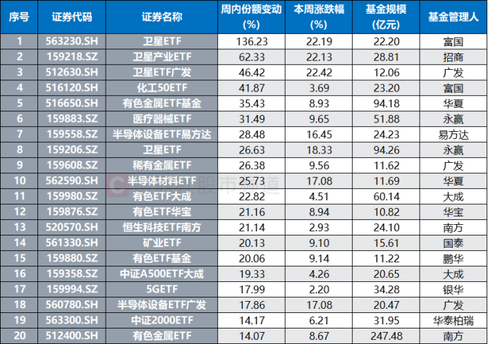 若统计整个ETF市场,筛选规模在10亿元以上的ETF基金,截至1月8日数据,累计共有16只ETF在开年首周份额飙升超20%。其中,卫星ETF(563230)份额唯一翻倍,卫星产业ETF(159218)、卫星ETF广发(512630)、化工50ETF(516120)、有色金属ETF基金(516650)、医疗器械ETF(159883)等ETF周内也份额增长明显。
