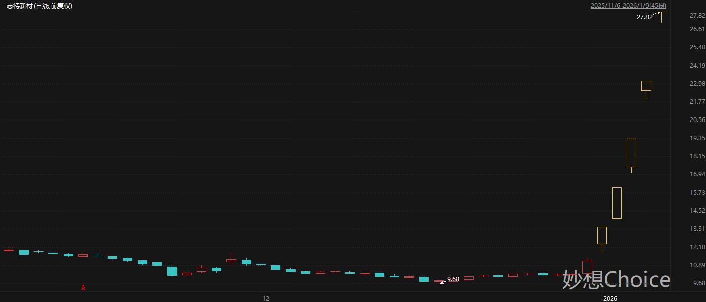 志特新材是2026年第一周首只翻倍股,该股全周连收5个20CM涨停板。拉长时间来看,志特新材股价自2025年12月低点迄今累计最大涨幅187%。数据显示,志特新材集AI应用、机器人、量子科技等热门概念于一身。消息面上,近日被称之为“科技春晚”的《中国科技创新盛典》正式播出,志特新材代理的防火隔热材料产品在节目中亮相。1月8日,志特新材在互动平台表示,公司代理的防火隔热材料产品目前仍处于实验室研发优化阶段,暂未达到量产条件,尚未产生相关营业收入。财通证券分析师陈悦明10月30日研报认为,志特新材铝模主业在国内与海外市场均不断突破。上半年公司布局“AI for Science+量子计算”研发新材料,当前已有隔热产品从市场反馈来看,客户对其性能优势及成本竞争力给予了肯定。