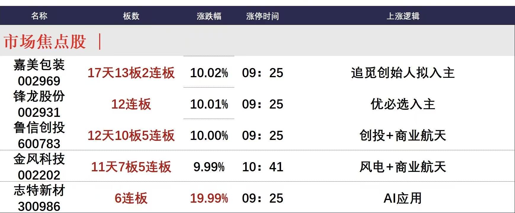 今日午盘全市场共125股涨停,连板股总数43只,32股封板未遂,封板率为80%(不含ST股、退市股)。焦点股方面,复牌的嘉美包装再度涨停走出17天13板,锋龙股份继续一字涨停晋级12连板,商业航天概念股鲁信创投12天10板、金风科技11天7板,AI应用概念股志特新材录得20CM6连板。