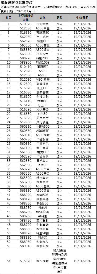 【导读】98只产品纳入,ETF互联互通开年大扩容。新年伊始,ETF互联互通迎来开年首次大扩容。近期,港交所发布最新调整的“ETF通”名单。根据最新名单,1月19日,将有54只上交所上市的ETF正式纳入北向沪股通,同时还有44只深交所上市的ETF纳入北向深股通,另外还有7只ETF被暂时移出陆股通。届时,“ETF通”的全部产品数量将由273只扩容至364只,增幅超过三成。