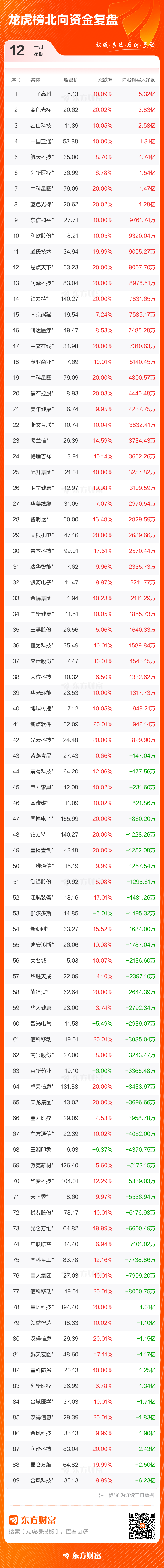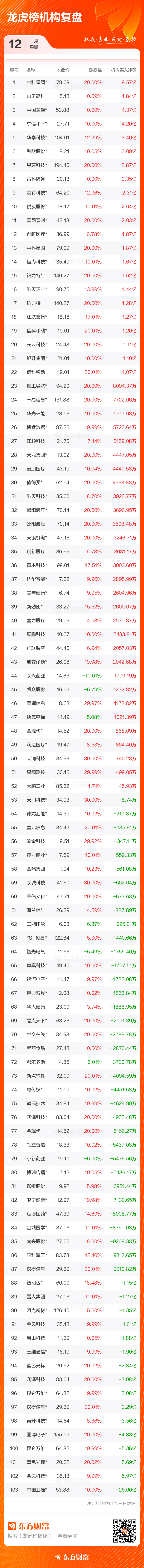 1月12日共有128只个股(含2只可转债)上榜龙虎榜,总上榜成交额479.82亿元。上榜个股中净买入额最高的是昆仑万维,金额为10.25亿元。