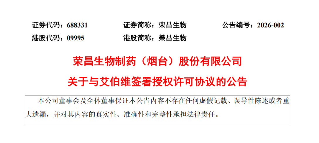 1月12日晚间,荣昌生物发布公告称,其就在研产品RC148与艾伯维签署独家授权许可协议,根据协议,艾伯维将获得RC148在大中华区以外地区的开发、生产和商业化的独家权利。