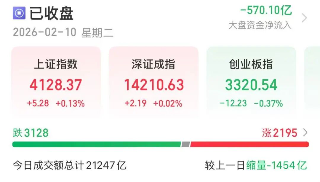 2月10日,A股市场小幅震荡。截至收盘,沪指涨0.13%,深证成指涨0.02%,创业板指跌0.37%。全市场成交额21247亿元。