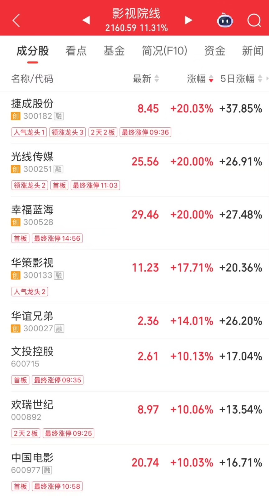 今日,影视院线板块、文化传媒板块强势领涨。捷成股份、欢瑞世纪、上海电影等连板涨停。