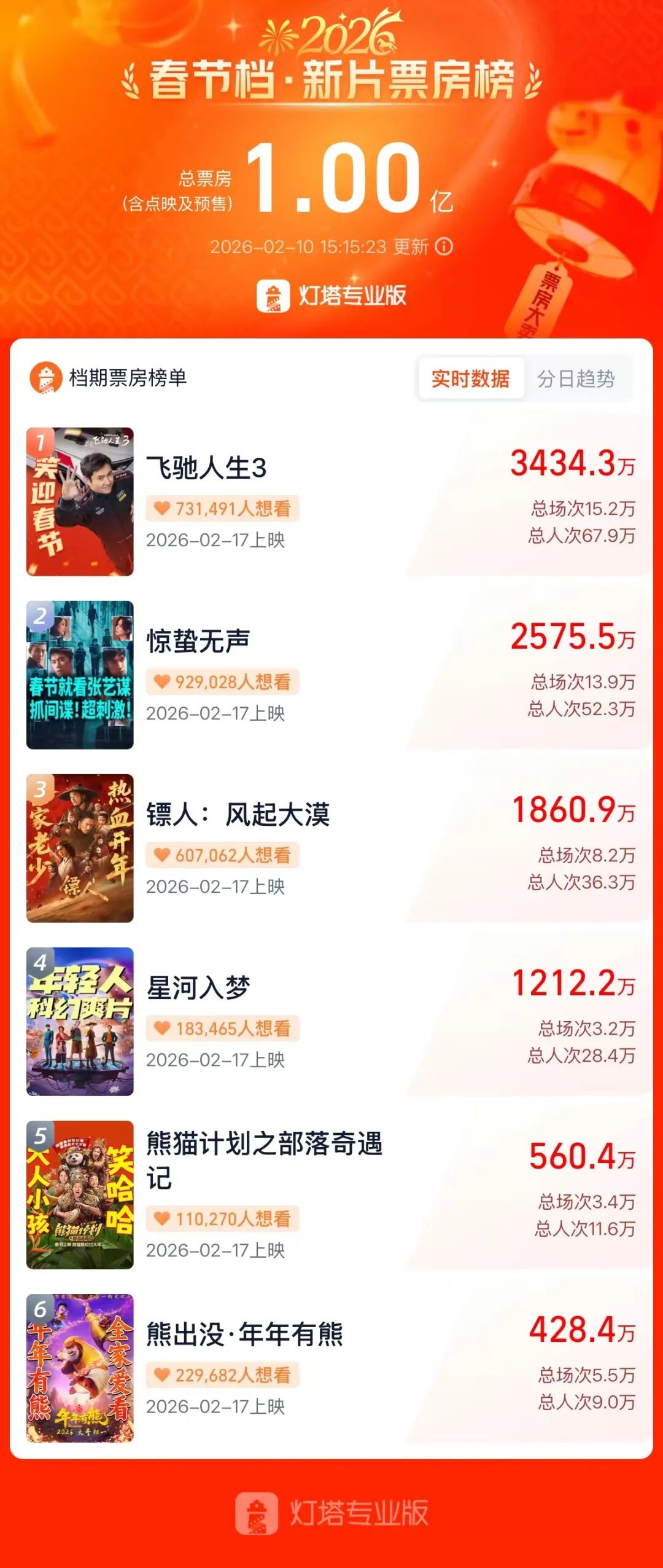 多重利好因素共振,成为推动横店影视股价持续走强的核心动力:首先,春节档预售火爆,公司深度参投头部影片直接受益,引发市场资金关注。2026年春节档电影预售于2月9日10点正式开启,截至2月10日15点15分,春节档预售总票房(含点映及预售)达到1亿元,市场热度持续攀升。灯塔专业版显示,春节预售票房榜前六名的影片中,横店影视为《飞驰人生3》《星河入梦》《熊出没·年年有熊》这三部影片的出版发行方之一。其中,《飞驰人生3》凭借3434.3万元的预售成绩位居第一。