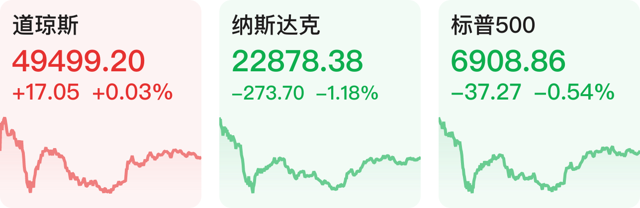 当地时间2月26日,美股三大指数收盘涨跌不一,纳指跌1.18%,标普500指数跌0.54%,道指涨0.03%。大型科技股多数下跌,英伟达跌超5%;特斯拉跌超2%,谷歌、亚马逊跌超1%,苹果小幅下跌;奈飞涨超2%,微软、Meta小幅上涨。热门中概股多数下跌,名创优品、百度跌超5%,理想汽车、阿里巴巴、金山云跌超2%。