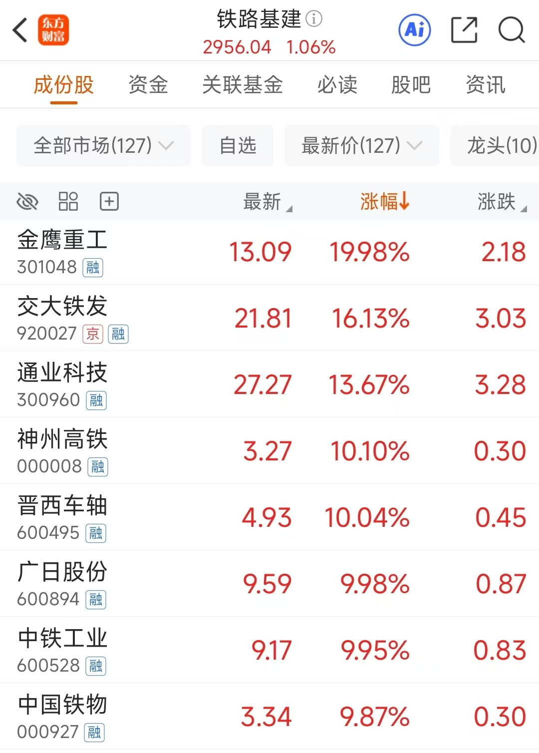 铁路基建板块3月31日早盘表现强势,金鹰重工、神州高铁、晋西车轴、广日股份、中铁工业、中国铁物涨停;交大铁发、通业科技大涨超10%。