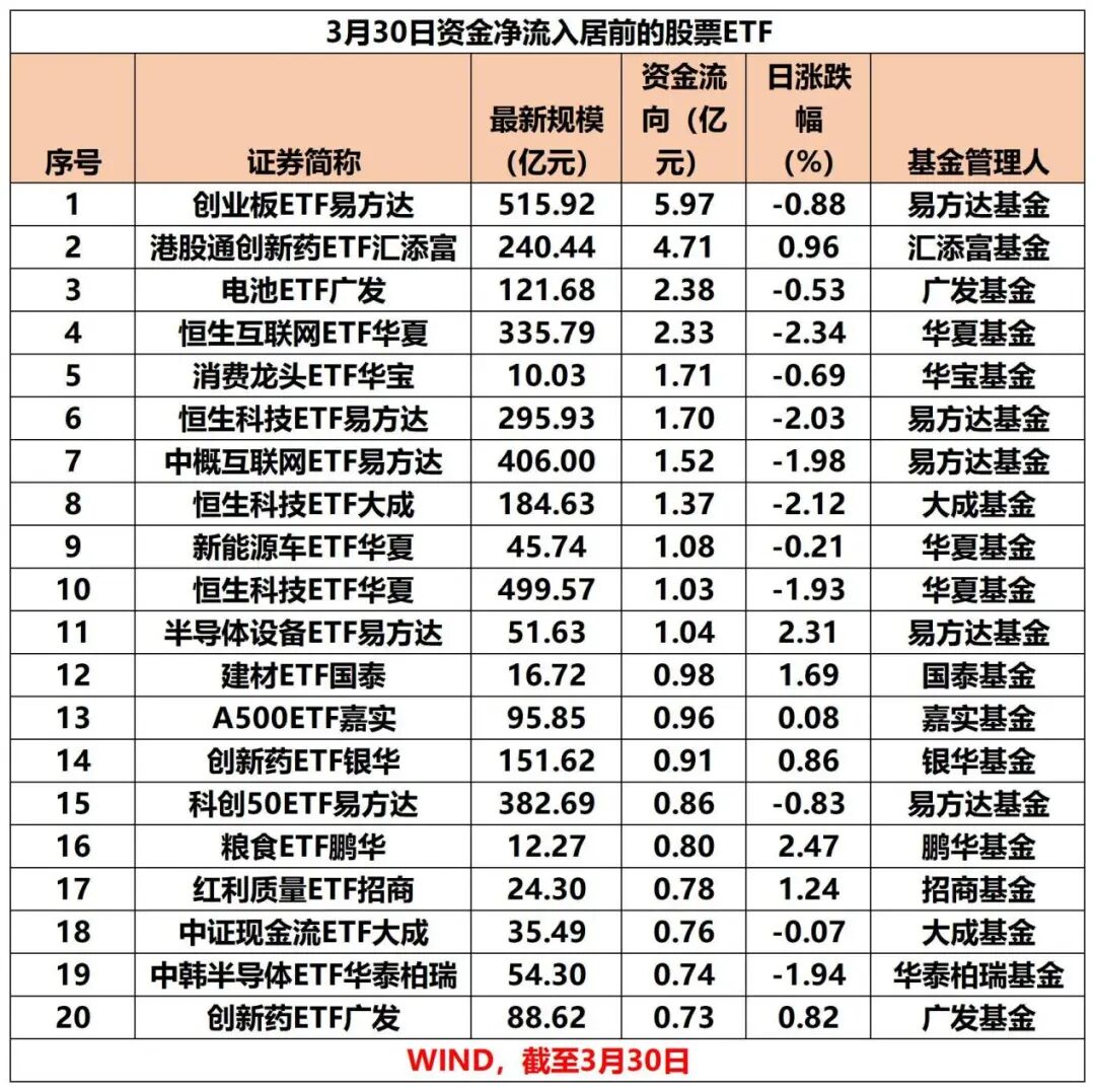 3月30日,全市场股票ETF(含跨境ETF)资金净流出110.46亿元。