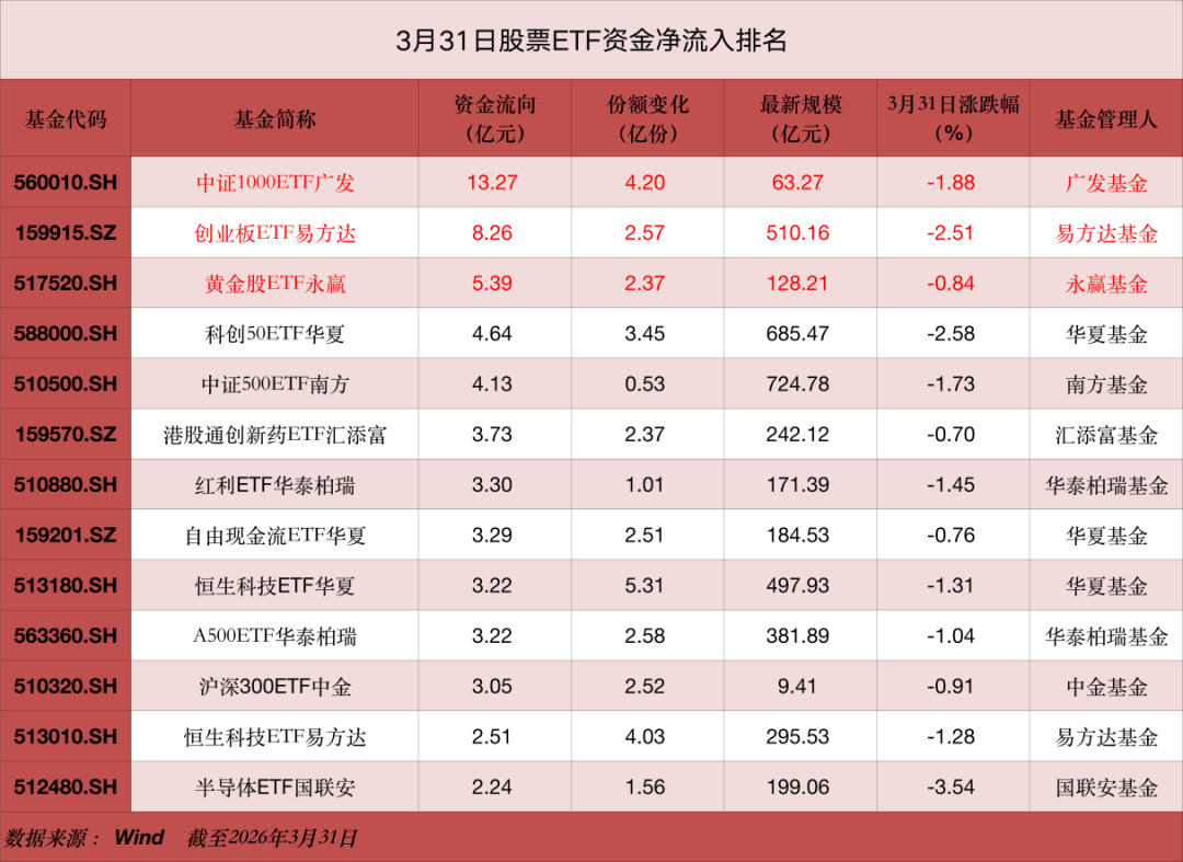 市场下跌背景下,资金借道ETF“越跌越买”特征明显。3月31日,股票ETF市场整体净流入资金超30亿元,债券ETF与商品ETF亦成为资金“避风港”。