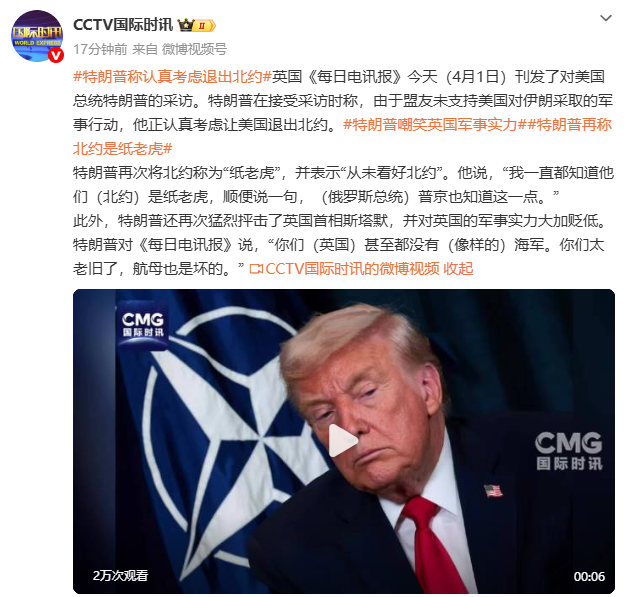 英国《每日电讯报》今天(4月1日)刊发了对美国总统特朗普的采访。特朗普在接受采访时称,由于盟友未支持美国对伊朗采取的军事行动,他正认真考虑让美国退出北约。