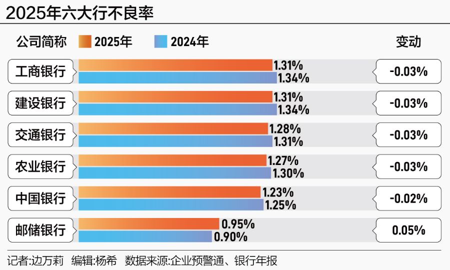 截至2025年末,工商银行、建设银行不良率均为1.33%,同比均下降0.01个百分点;交通银行、农业银行不良率均为1.28%,同比分别下降0.03个百分点、0.02个百分点;中国银行不良率1.24%,同比下降0.01个百分点。