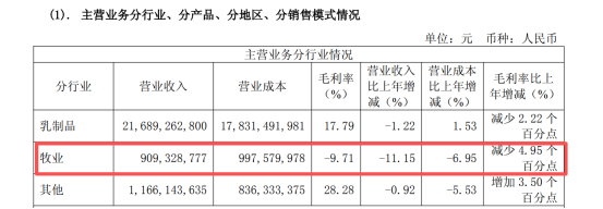 体现在报表上,牧业板块2025年实现营收9.09亿元,同比下降11.15%;毛利率为-9.71%,较上年减少4.95个百分点。