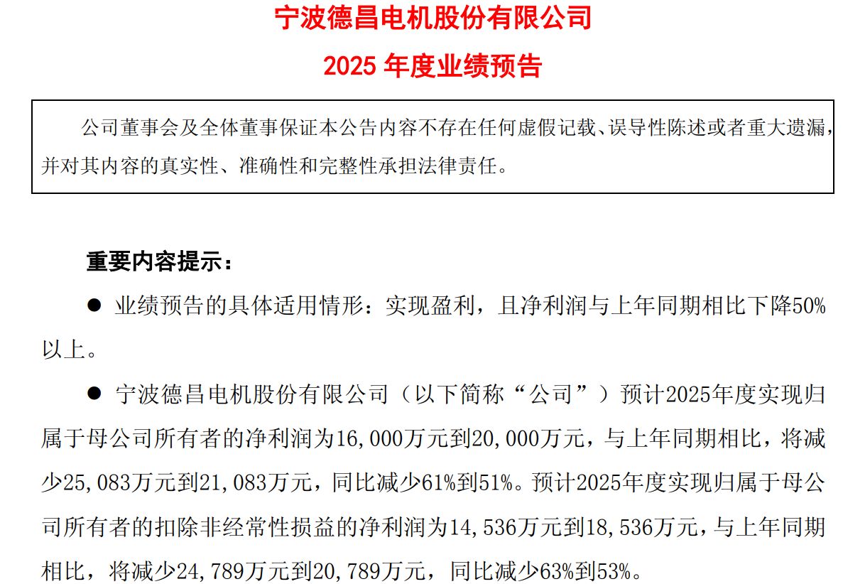 据德昌股份发布的2025年度业绩预告,预计2025年全年实现归属于母公司所有者的净利润为1.60亿元到2.00亿元,同比减少61%到51%;扣除非经常性损益的净利润为1.45亿元到1.85亿元,同比减少63%到53%。