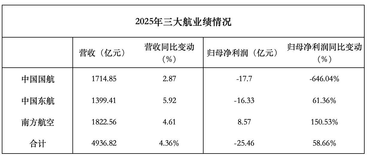 截至4月1日,中国国航、中国东航、南方航空均已完成2025年年报披露。数据显示,2025年,三大航合计实现营收4936.82亿元,同比增长4.36%;归母净利润-25.46亿元,同比增长58.66%。