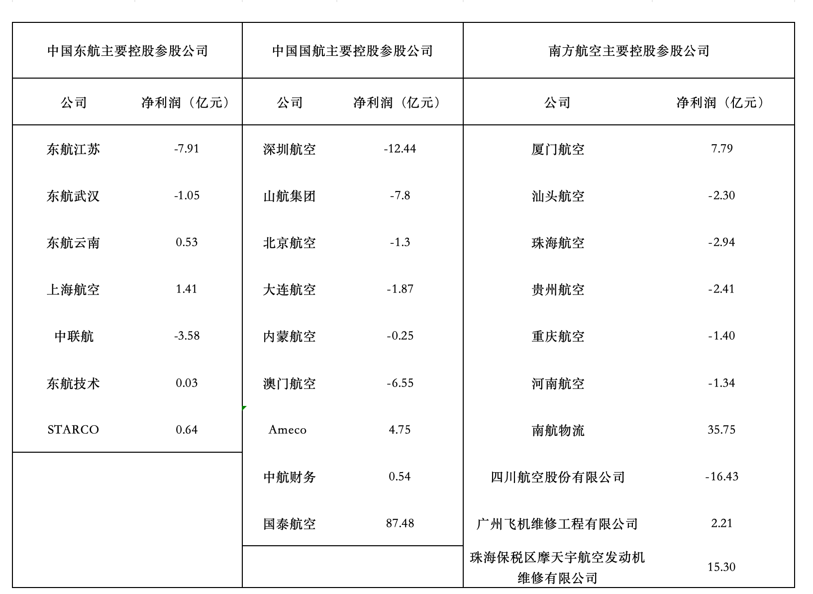 在航空公司主业之外,参股及控股子公司的业绩贡献也是影响三大航业绩的重要因素。