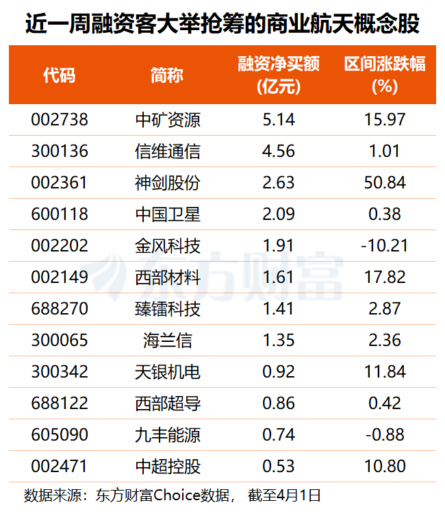 资金方面,东方财富Choice数据显示,近一周共有8只商业航天概念股获得超亿元融资净买入,其中,中矿资源获杠杆资金加仓5.14亿元,信维通信获融资客抢筹4.56亿元,神剑股份、中国卫星分别获融资净买入2.63亿和2.09亿元,金风科技、西部材料、臻镭科技、海兰信融资净买额均在1.3亿元以上。
