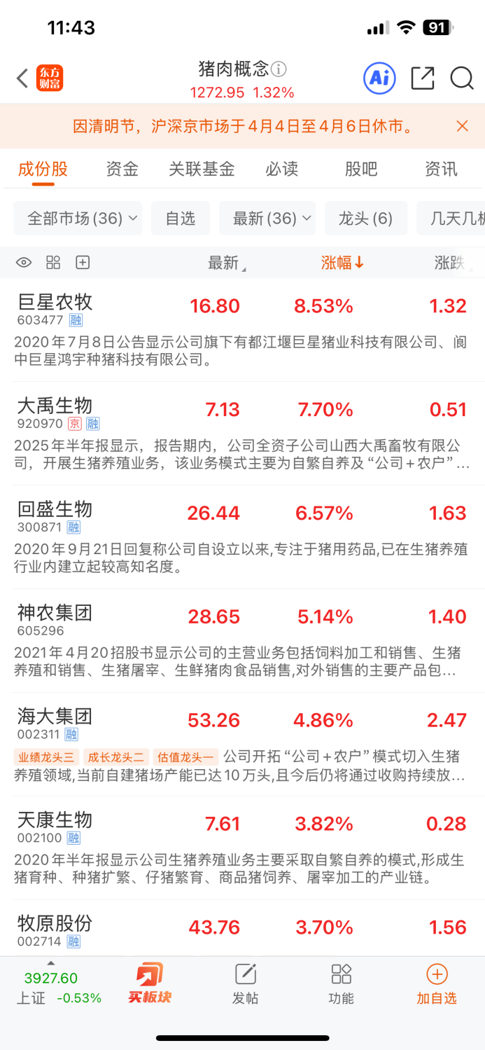4月2日早盘,两市震荡调整,猪肉概念股异动拉升,截至早间收盘,板块上涨1.32%,涨幅居概念板块前列。个股方面,巨星农牧涨超8%,大禹生物涨超7%,回盛生物涨超6%,神农集团涨超5%,海大集团、天康生物、牧原股份、立华股份、华统股份等多股涨超3%。