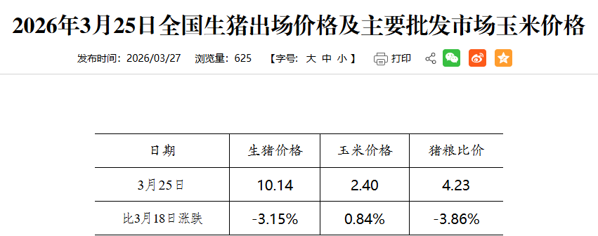此前,发改委价格监测中心发布2026年3月第4周猪粮比及猪价分析情况。当周全国生猪价格为10.14元/公斤,环比下跌3.15%,连续8周环比下跌,连续5周创2019年以来最低价;玉米价格为2.40/公斤,环比上涨0.84%,连续3周环比上涨,涨至近7个月最高价;猪粮比价为4.23,环比下降 3.86%,连续8周环比下降,连续2周创下2019年以来新低,远远低于5∶1的一级预警线。