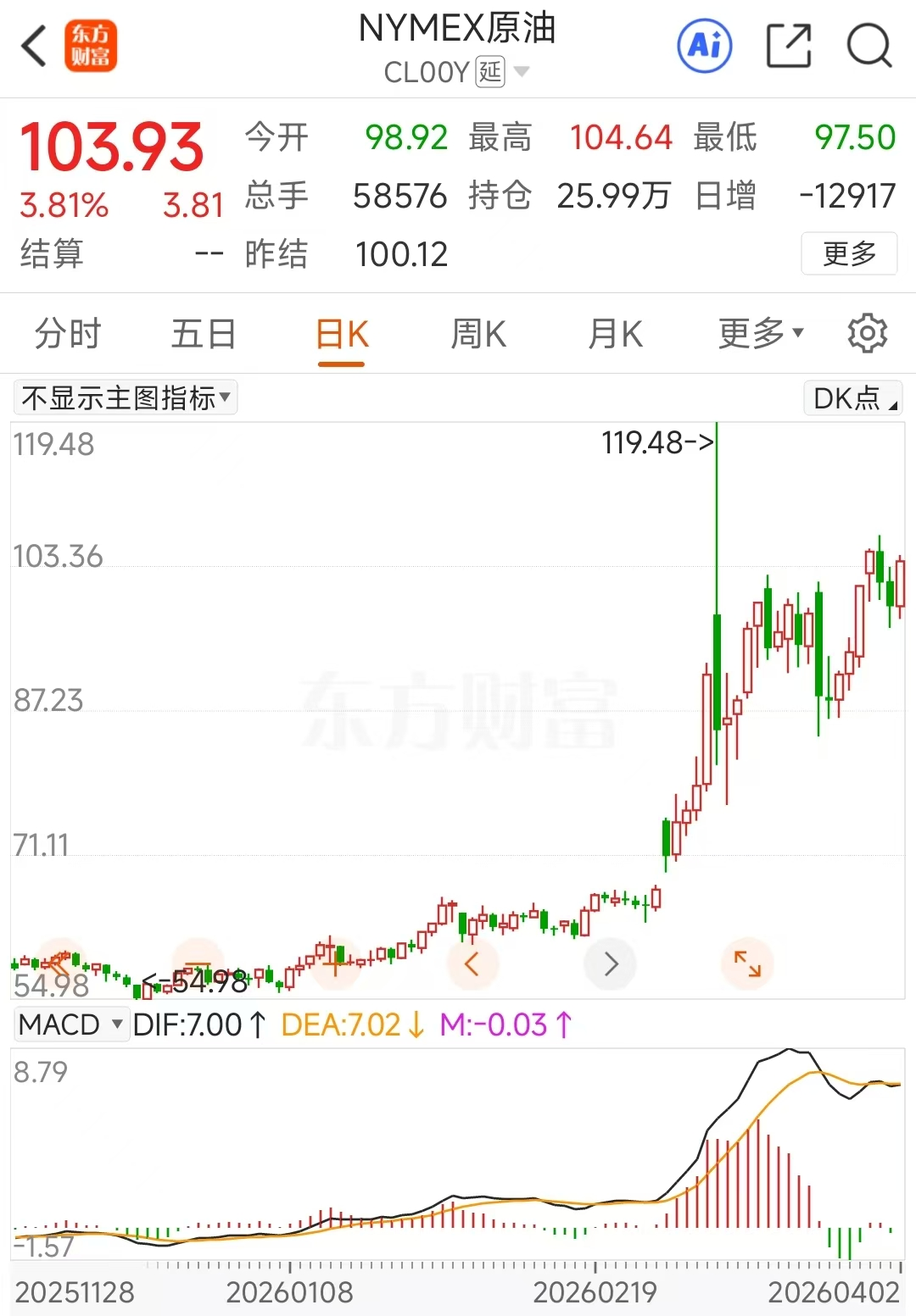 受特朗普最新讲话刺激,布伦特原油和WTI原油均出现短时快速拉升的走势。布伦特原油从99美元附近快速拉升至105美元上方,WTI原油从97美元附近拉升至104美元附近。截稿时,布伦特原油日内大涨超4%,WTI原油大涨超3%。