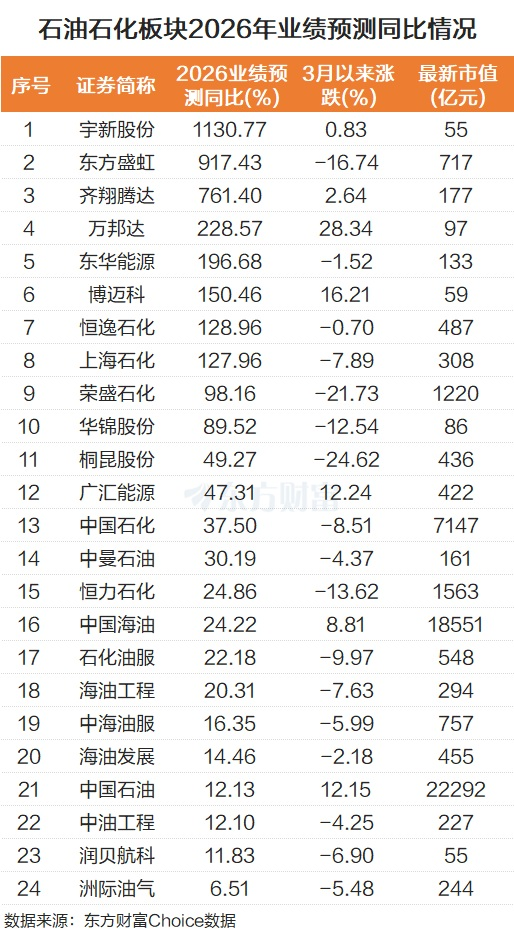 从机构预测的业绩同比增速来看,宇新股份暂居首位,2026年业绩预计同比增长1130.77%。东方盛虹紧随其后,2026年业绩预测同比增长917.43%。齐翔腾达、万邦达、东华能源、博迈科、恒逸石化、上海石化业绩预测同比也翻倍。整体而言,目前石油石化板块中有24股,机构预测了2026年的业绩增速情况。