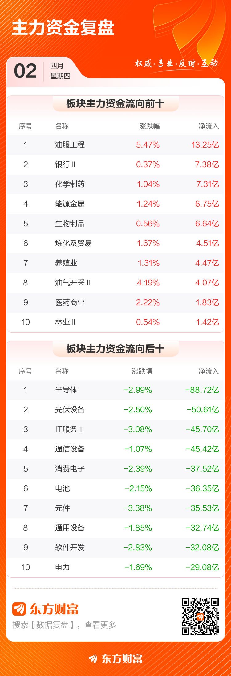 4月2日,沪指跌0.74%,深成指跌1.6%,创业板指跌2.31%。两市成交额1.84万亿,较上个交易日缩量1695亿。数据显示,今日大盘主力资金净流出864.36亿。油服工程、银行Ⅱ、化学制药等板块主力资金流入排名居前,其中油服工程净流入13.25亿元。