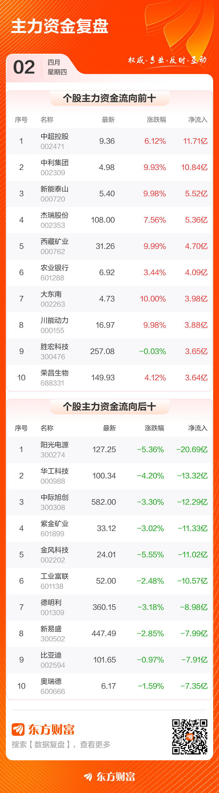 主力净买入个股中,中超控股排名第一,主力净买入11.71亿元;中利集团排名第二,主力净买入10.84亿元。