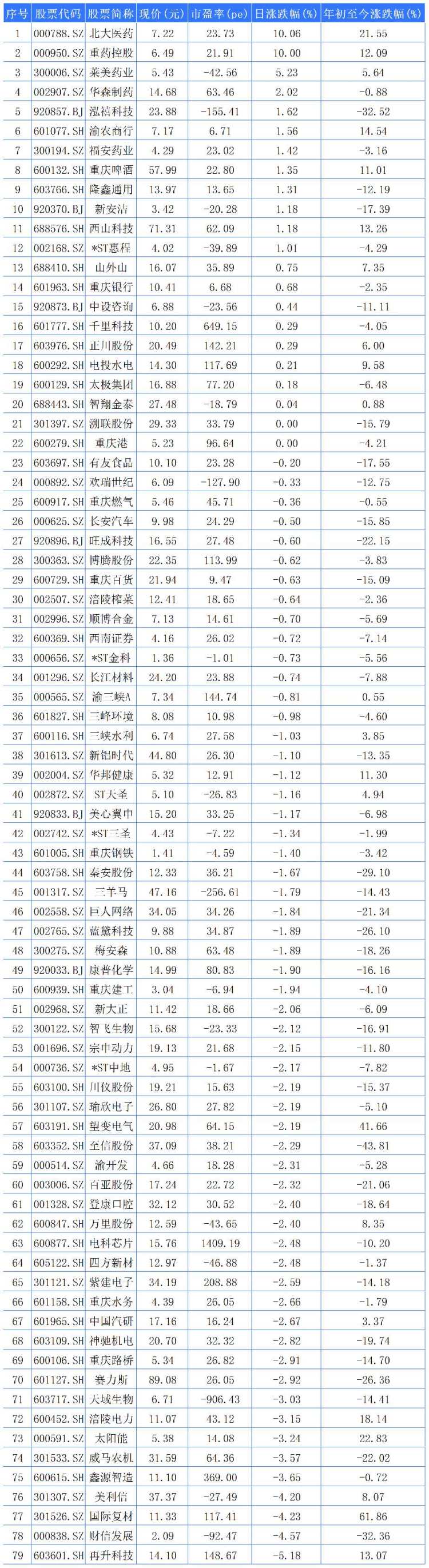 79家重庆A股上市公司中,20家上涨,2家平收,57家下跌。