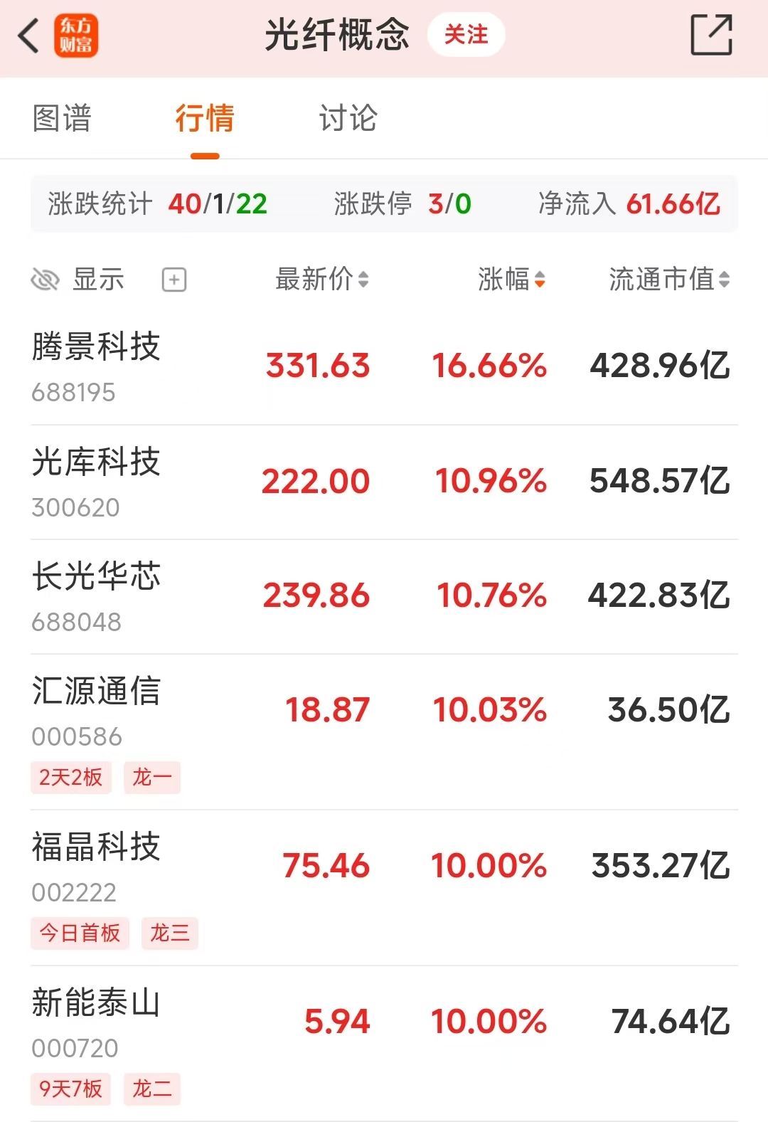 光纤概念4月3日早盘表现强势,汇源通信、福晶科技、新能泰山涨停;腾景科技、光库科技、长光华芯大涨超10%;亨通光电、光迅科技、长飞光纤也涨幅靠前。
