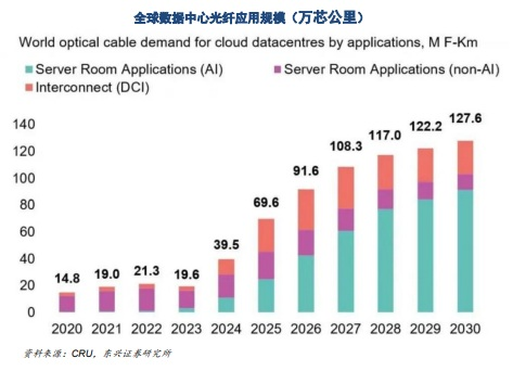 根据CRU最新报告,2026年全球数据中心光纤需求预计达到9160万芯公里,同比增长32%。根据具体应用场景,可以看到,2026年AI应用、非AI应用和数据中心互连(DCI)应用的光纤需求均实现较快增长。展望2030年,全球数据中心光纤需求预计达到1.28亿芯公里,其中AI应用的光纤需求超过8000万芯公里,成为重要增长驱动力。