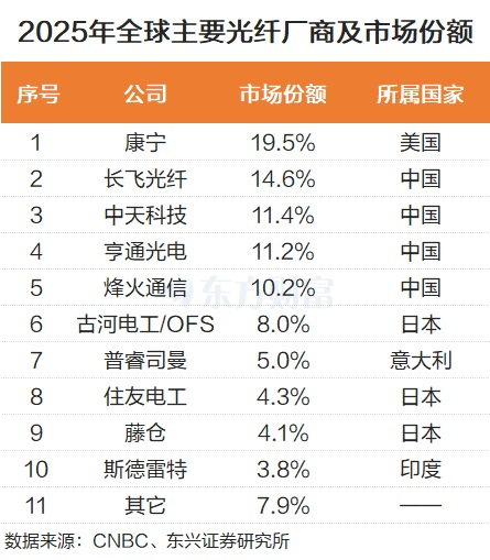 根据CNBC统计数据,2025年,长飞光纤占据全球光纤市场的比例为14.6%,排名全球第二,仅次于美国的康宁公司,该公司2025年在全球光纤市场中的份额为19.5%。我国的中天科技、亨通光电、烽火通信位列全球的第三、四、五的位置,市场份额分别为11.4%、11.2%和10.2%。