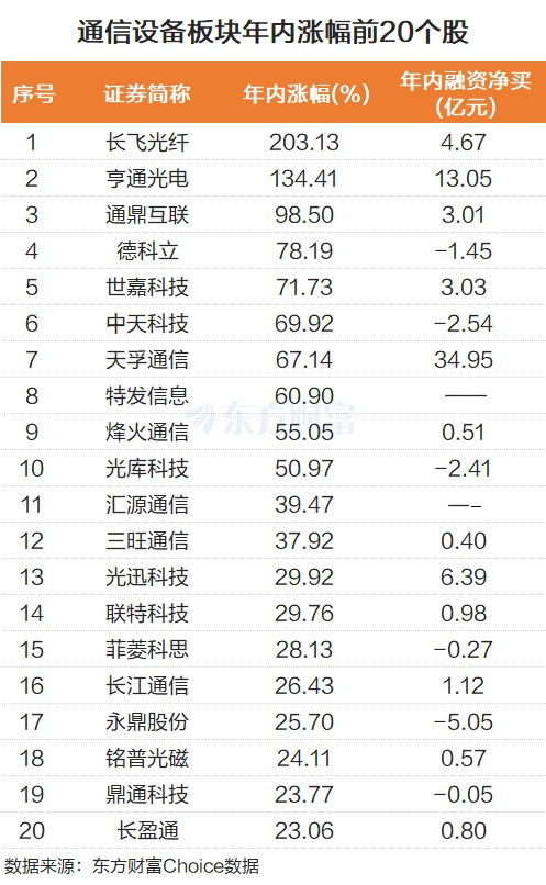 从杠杆资金角度来看,天孚通信、亨通光电年内被融资净买入超10亿元,具体分别为34.95亿元和13.05亿元。长飞光纤、通鼎互联等被融资净买入过亿。