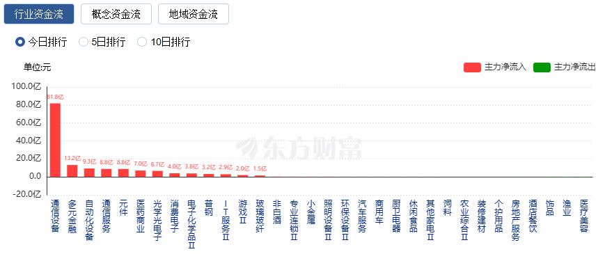 行业资金方面,截至收盘,通信设备、多元金融、自动化设备等净流入排名靠前,其中通信设备净流入81.79亿。